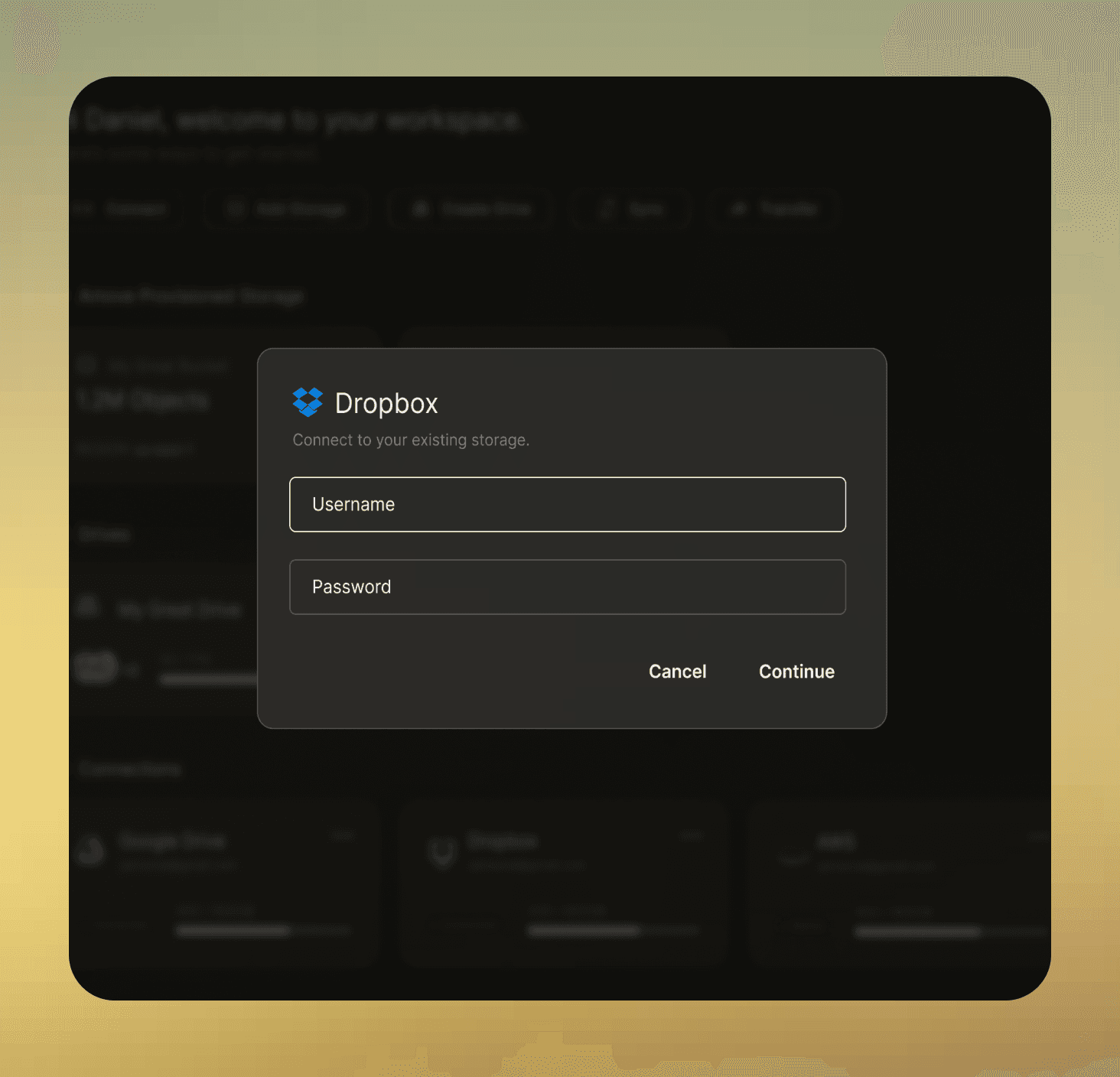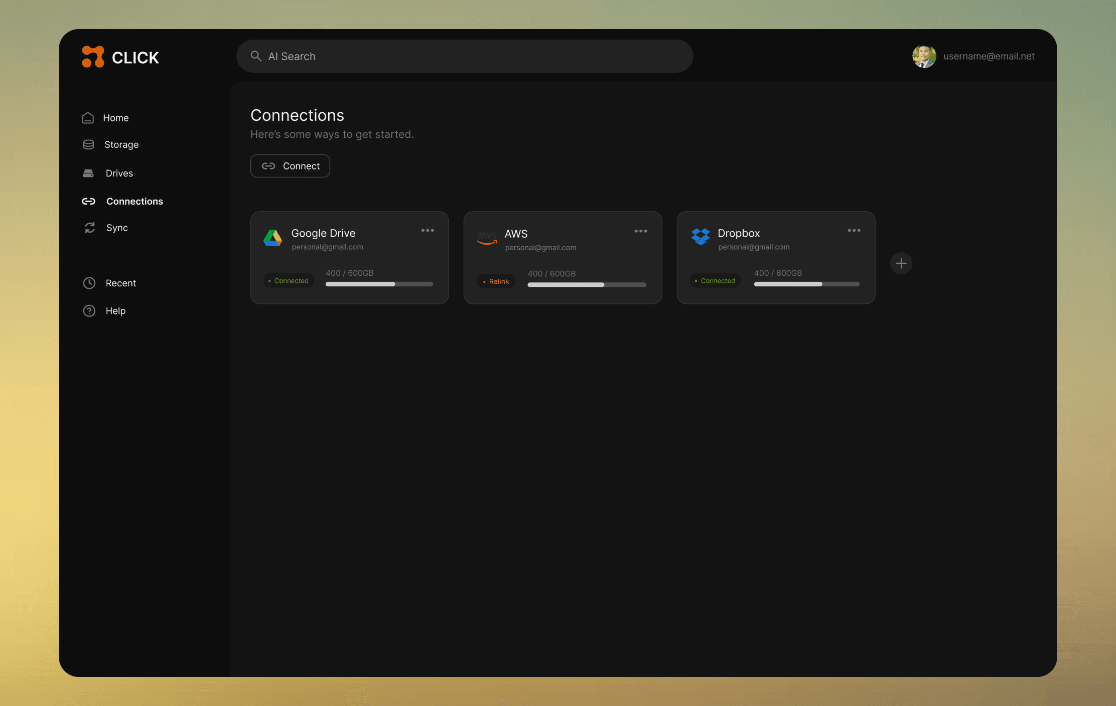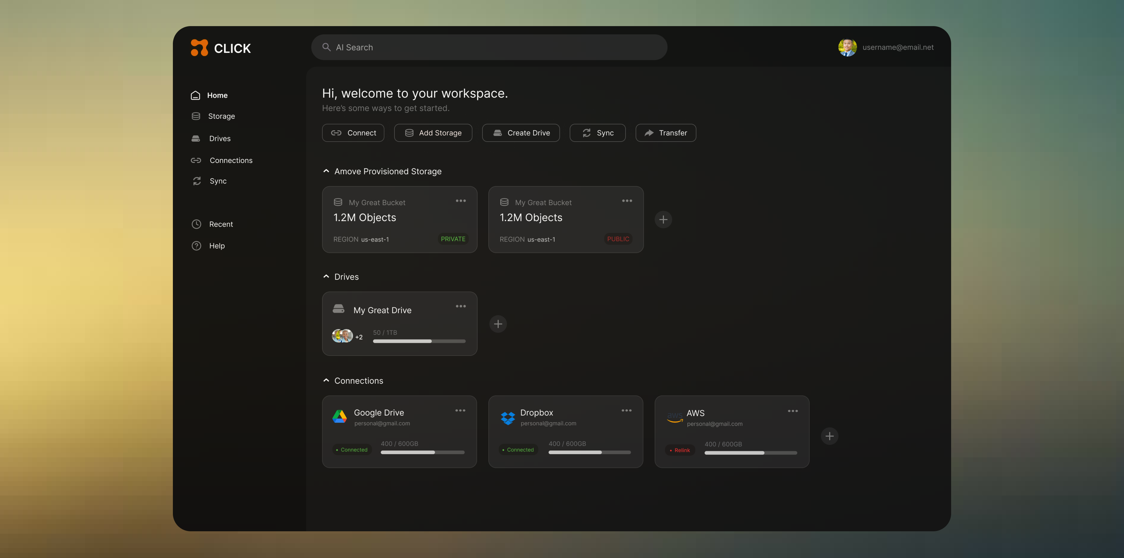 Amove is a cloud storage management platform that unifies distributed storage systems and simplifies workflows for teams and businesses. The internal web dashboard serves as a central hub for users to manage connected cloud drives, monitor syncs and backups, and configure account settings.
