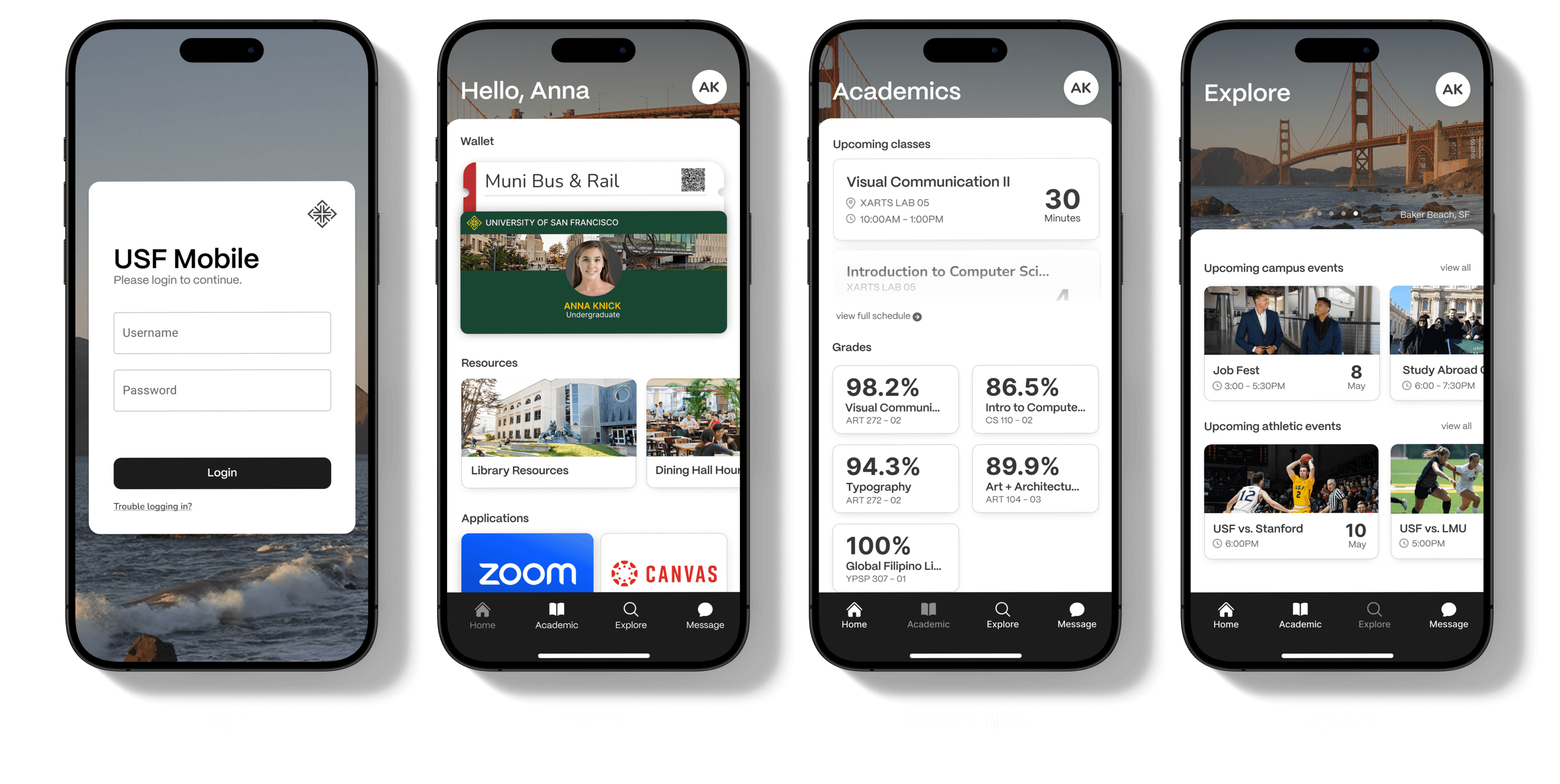 Instead of a color palette, I chose to use imagery of the Golden Gate Bridge, an iconic symbol of San Francisco, encouraging students to explore the city. The icon is the existing USF logo mark.