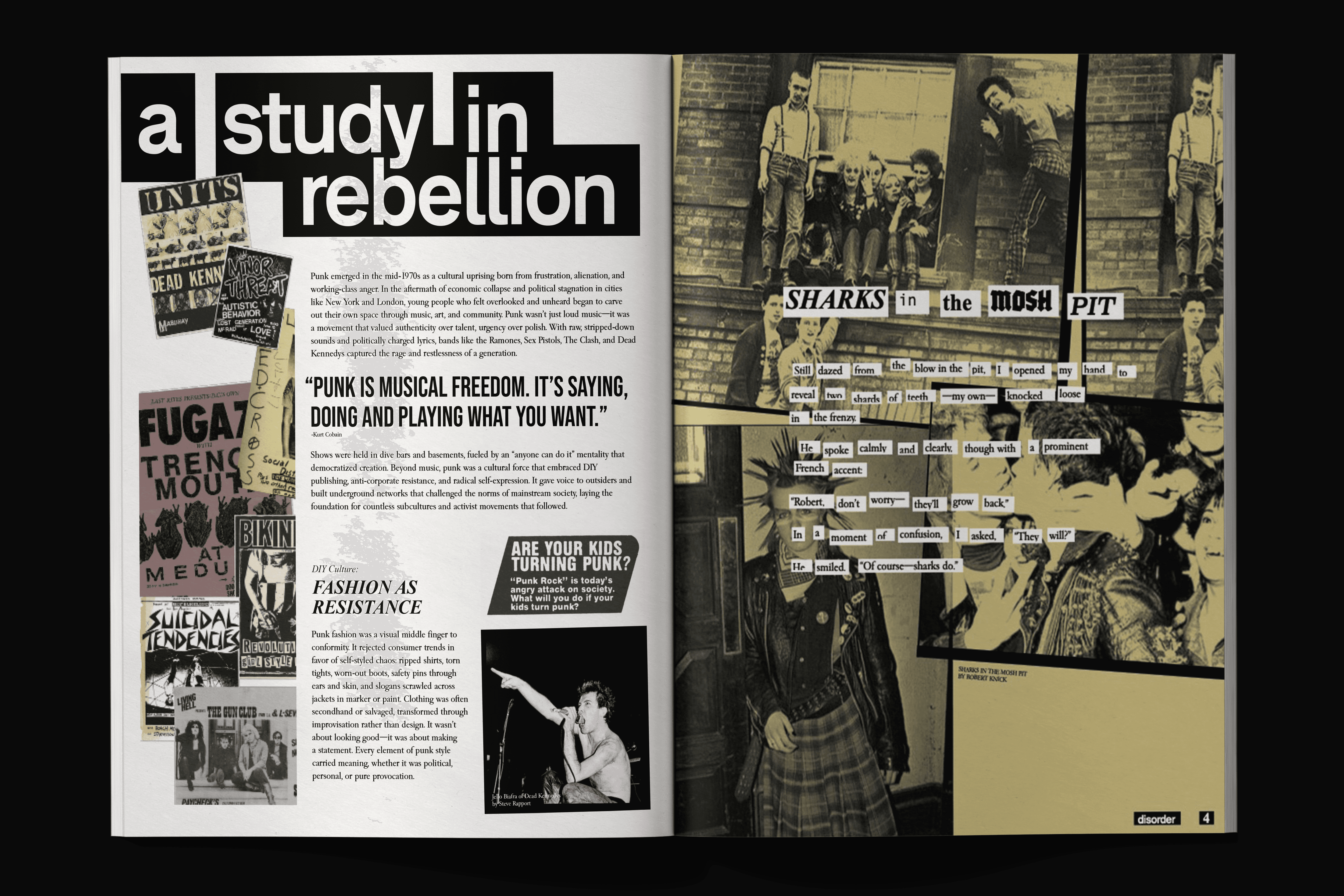Presented as a visually-driven magazine, the project examines how these movements used fashion, music, and visual language to reject mainstream values and articulate personal and political defiance. Drawing from archival research, personal interviews, and graphic experimentation, it considers how these subcultures constructed alternative modes of existence in the face of conformity, capitalism, and societal alienation.